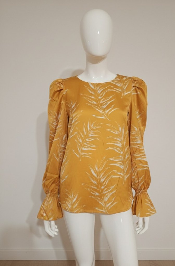 Kadınlar için sarı parlak ve ipeksi kumaştan yapılmış, drapeli bir bluz. Çağdaş ve bohem tarzları harmanlar.