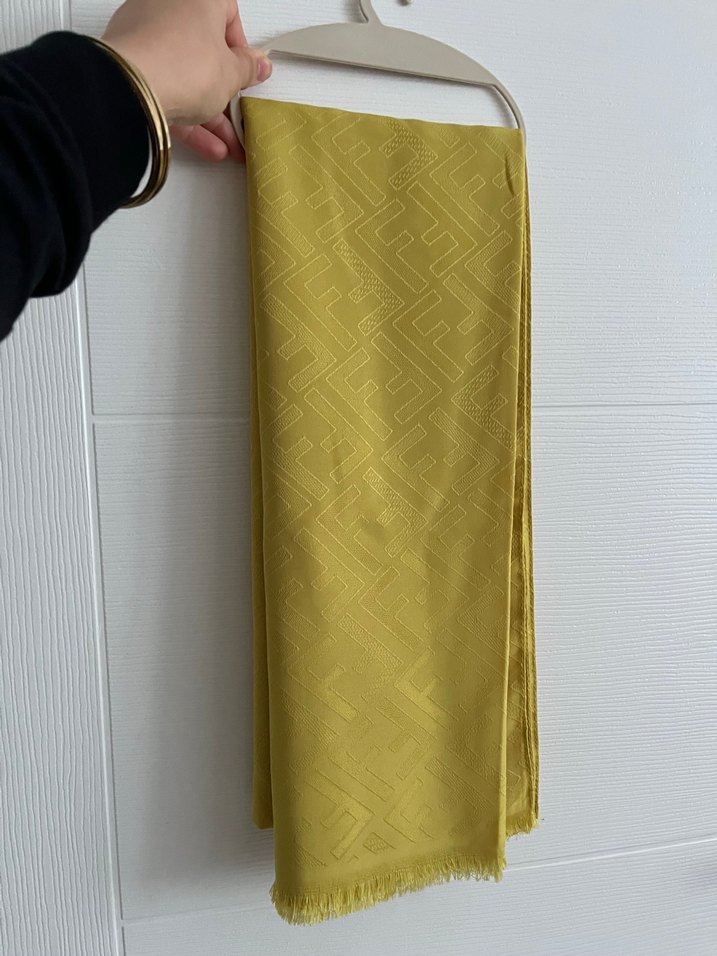 Hiç kullanılmadı Parlak sentetik kumaştan yapılmış, drapeli tasarıma sahip sarı kadın şalı, minimalist ve mütevazı bohem tarzını yansıtıyor.
