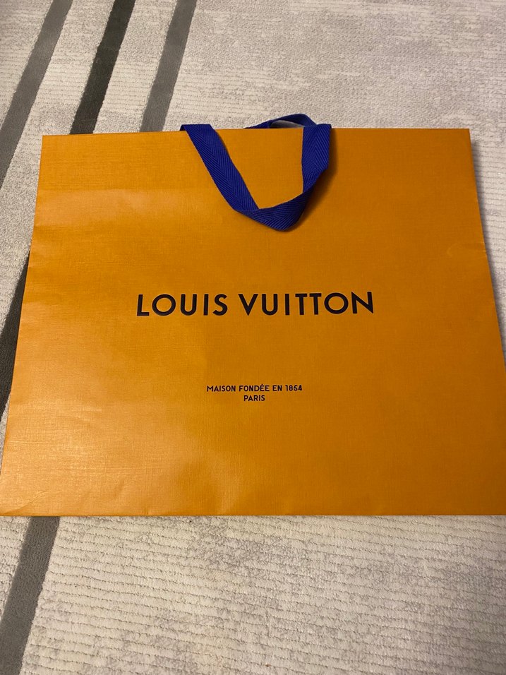 Sarı parlak Louis Vuitton kadın çantası, kağıt malzemeden, baskılı desen ve kurdele detaylıdır. Sokak stili ve günlük kullanım için uygundur.