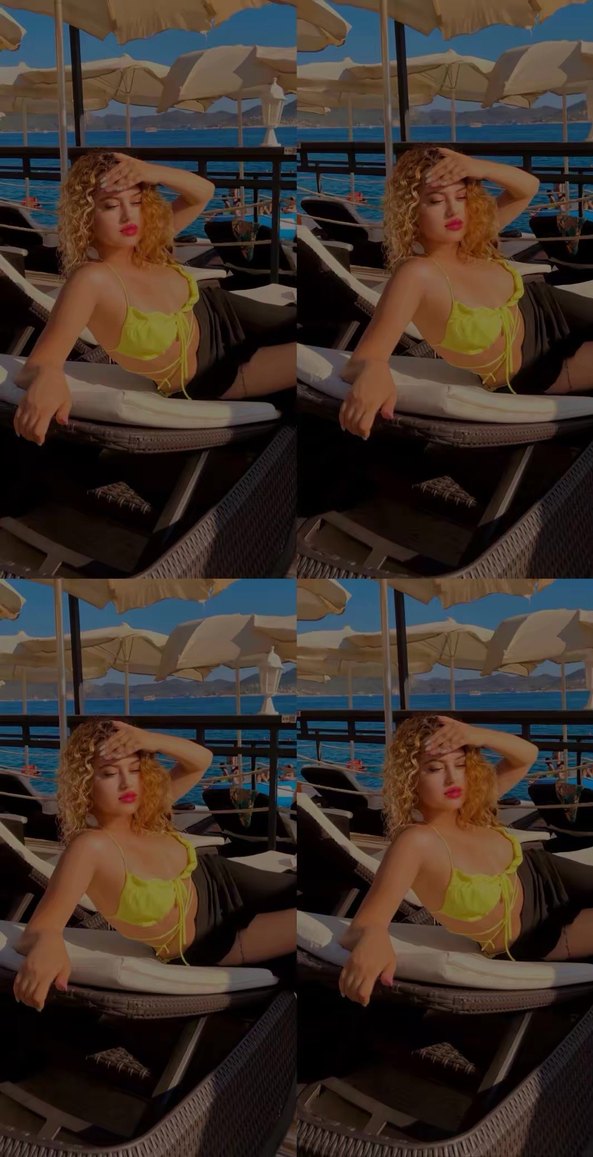 Parlak sarı renkte, straplez ve askılı kollu, detaylı, baskılı desene sahip mini ve vücuda oturan bikini takım