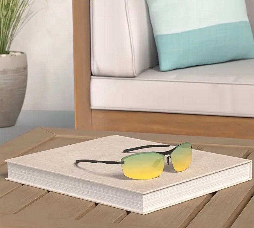Sarı parlak, minimalist tasarımlı araç sürüş gözlüğü, çağdaş stil ve trend günlük görünüm için uygundur. Gündüz güneşten gece araç ışıklarından sizi korur.