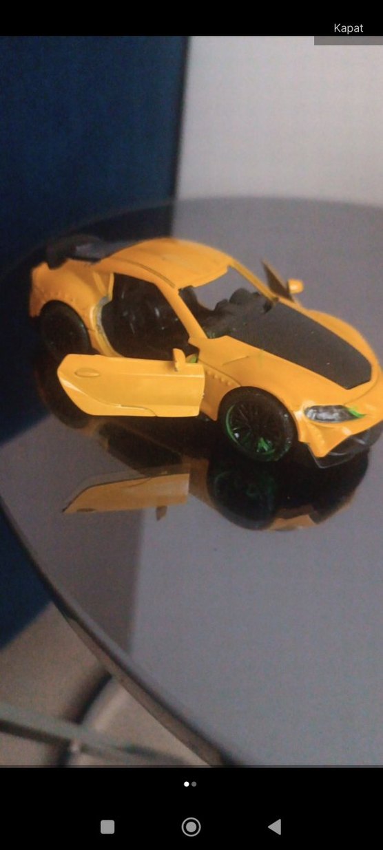 Kapıları açılabilen, siyah ve yeşil detaylara sahip parlak sarı oyuncak araba.