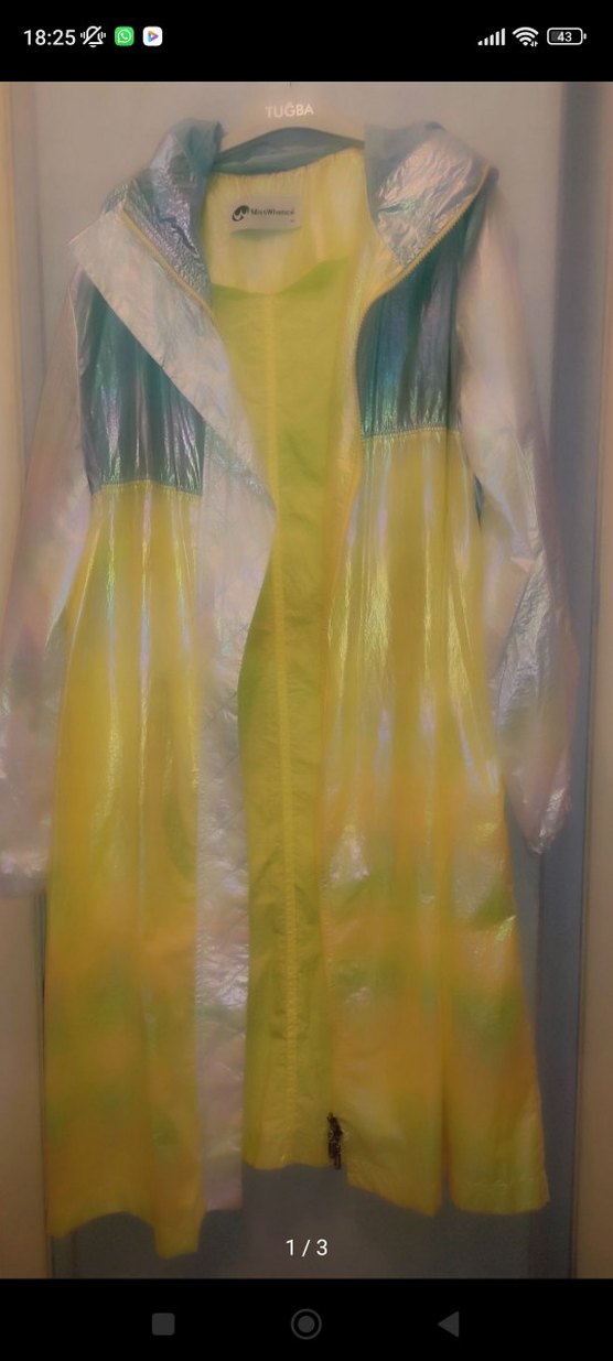Bu kadın yağmurluğu, drapeli, askısız yakalı ve bol kesimdir. Parlak sentetik kumaştan yapılmış, sarı batik desenli uzun boyda, avant-garde parti stilleri için uygundur. ️ markayı bilen bilir wisvence iki defa giyildi şık bir ürün...