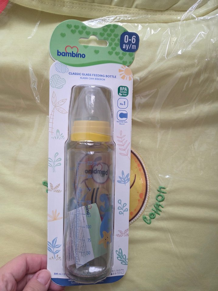 Bambino'nun 0-6 aylık bebekler için tasarlanmış, BPA içermeyen sarı pastel cam biberonu, yumuşak emzikli beslenme ürünü. Biberon normalde bu fiyat yanında kullanılmamış alt açma var