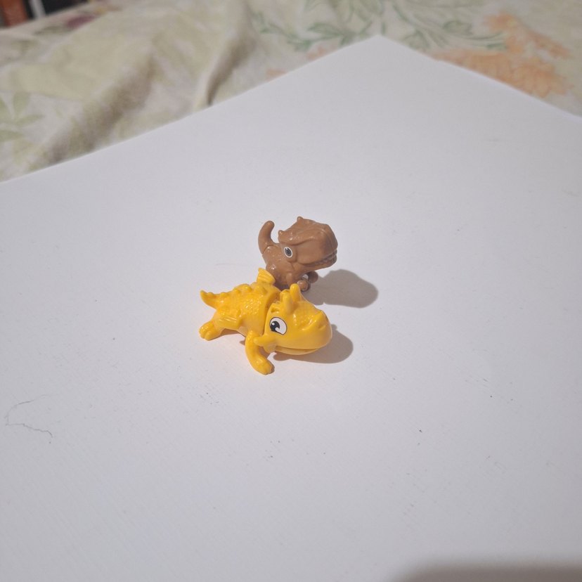 Sarı ve kahverengi pastel renkte, göz detaylı küçük dinozor aksiyon figürleri.