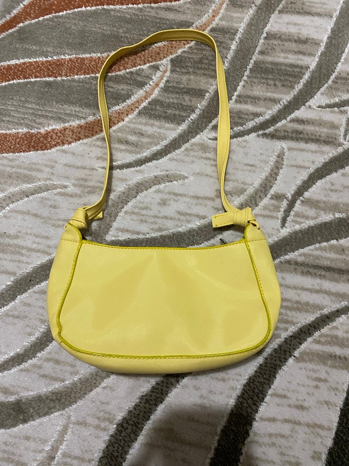Sarı pastel renkte, tokalı askılı ve batik desenli kadın omuz çantası, yumuşak sentetik kumaştan, trend günlük sokak stiline uygun.