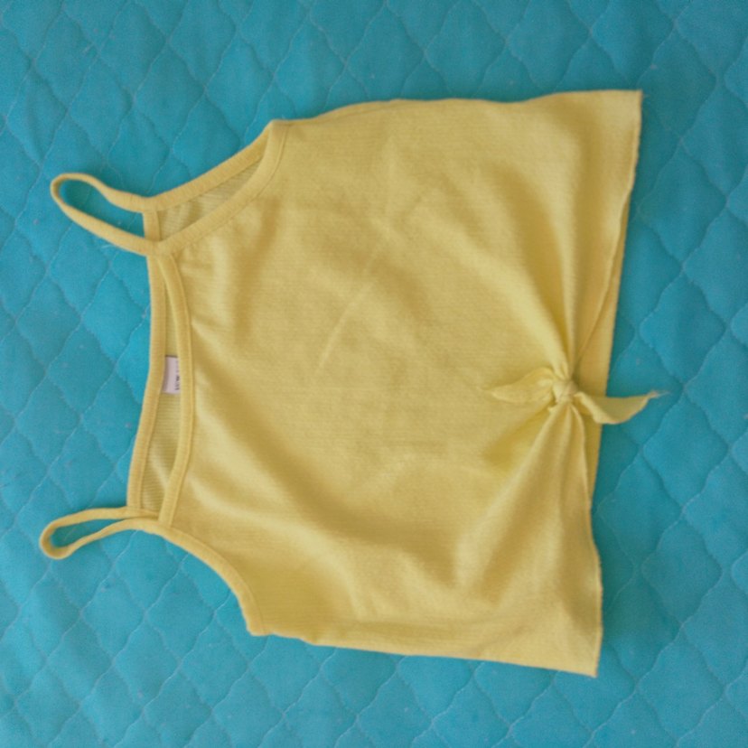 Yumuşak dokulu, ön kısmında küçük bağlama detayı bulunan sarı pastel kız çocuk crop.