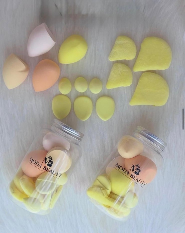 Çeşitli boyut ve şekillerde pastel sarı makyaj süngerleri, MODA Beauty etiketli şeffaf kavanozlarda saklanmaktadır. Yumuşak dokuludur.