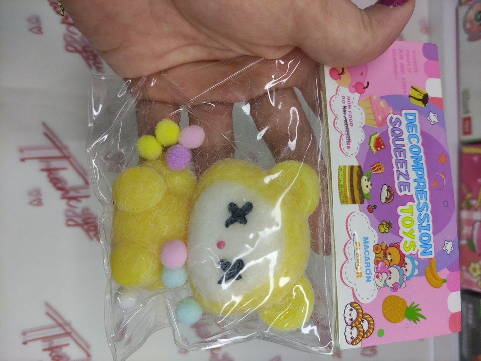 Yumuşak dokulu, pastel sarı renkte küçük peluş ayıcık oyuncak, renkli ponponlarla süslenmiştir. Şeffaf poşette paketlidir.