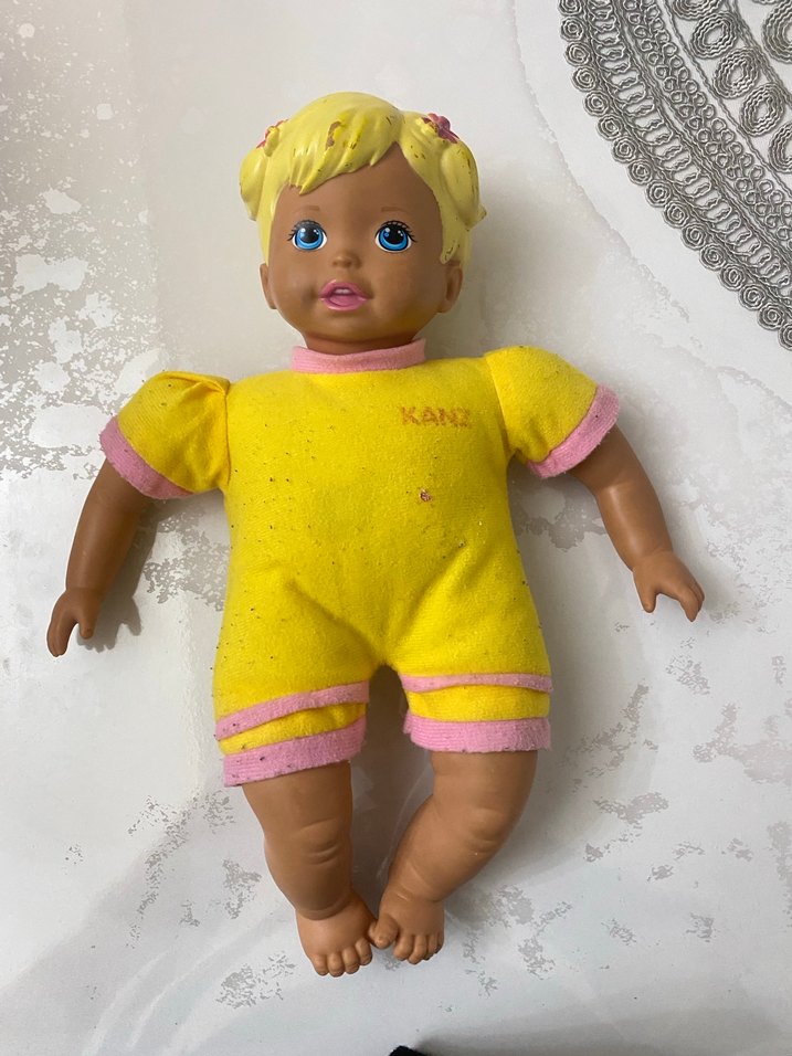 Pastel sarı ve pembe detaylı yumuşak kumaş kıyafetli, mavi gözlü ve sarı saçlı plastik bebek oyuncak. Oyun veya koleksiyon için uygun.