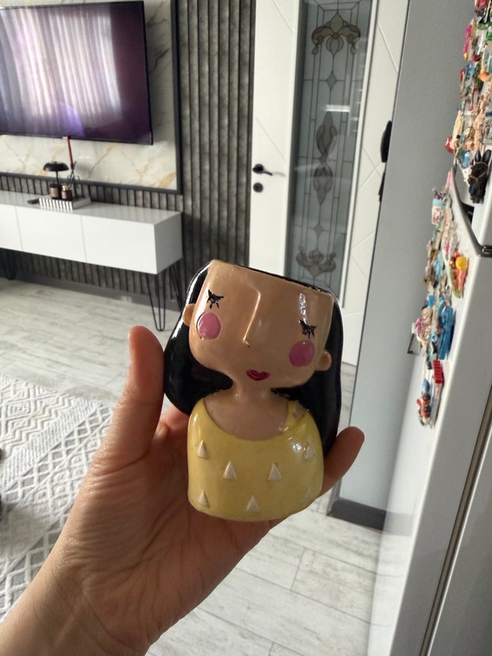 Pastel sarı elbise ve kapalı gözlü, pembe yanaklı kadın yüzü olan parlak ve sevimli tasarımlı figür.