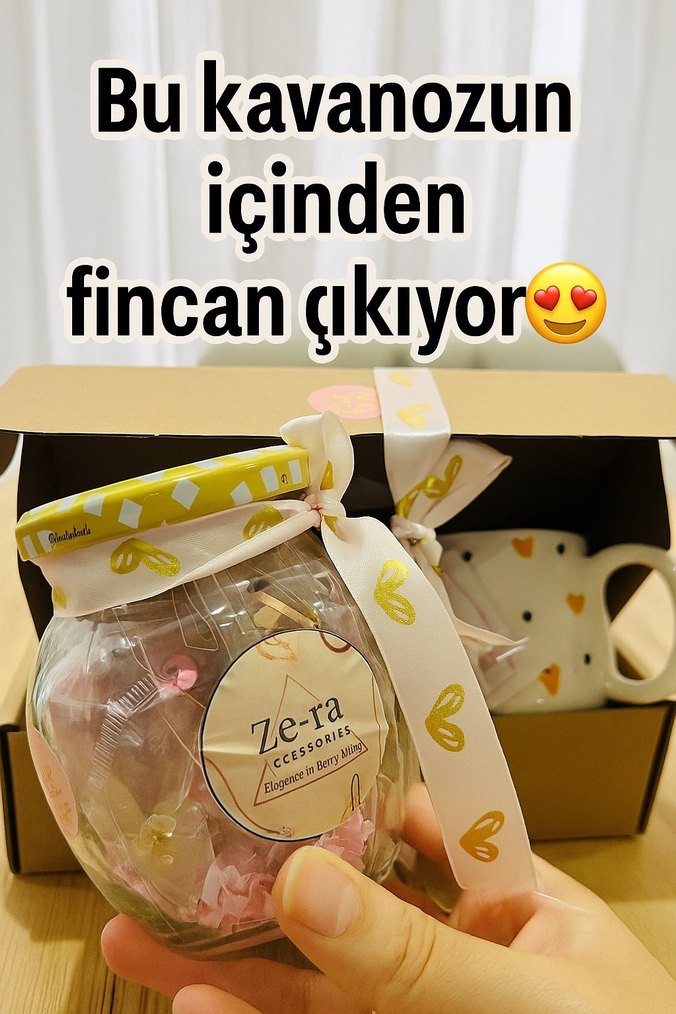 Pastel sarı renkte, üzerinde kurdele ve içinde fincan bulunan Ze-ra marka kavanoz seti.