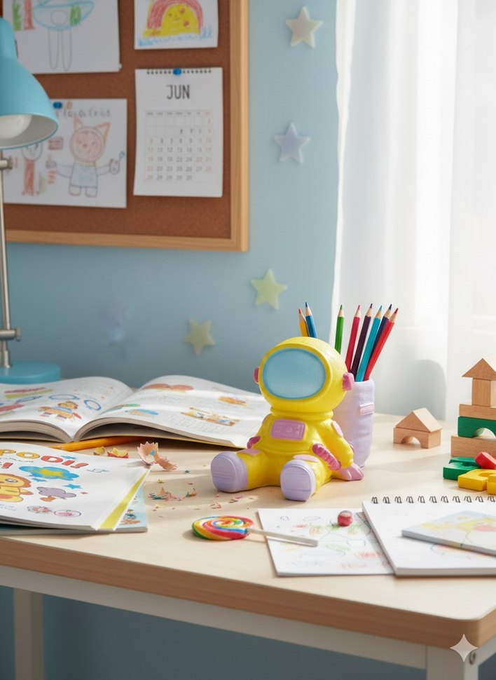 Pastel sarı renkte, küçük astronot şeklinde kalemlik ve renkli kalemler içeren okul aktivite malzemesi. Takvimde Haziran ayı görünüyor. ✏️