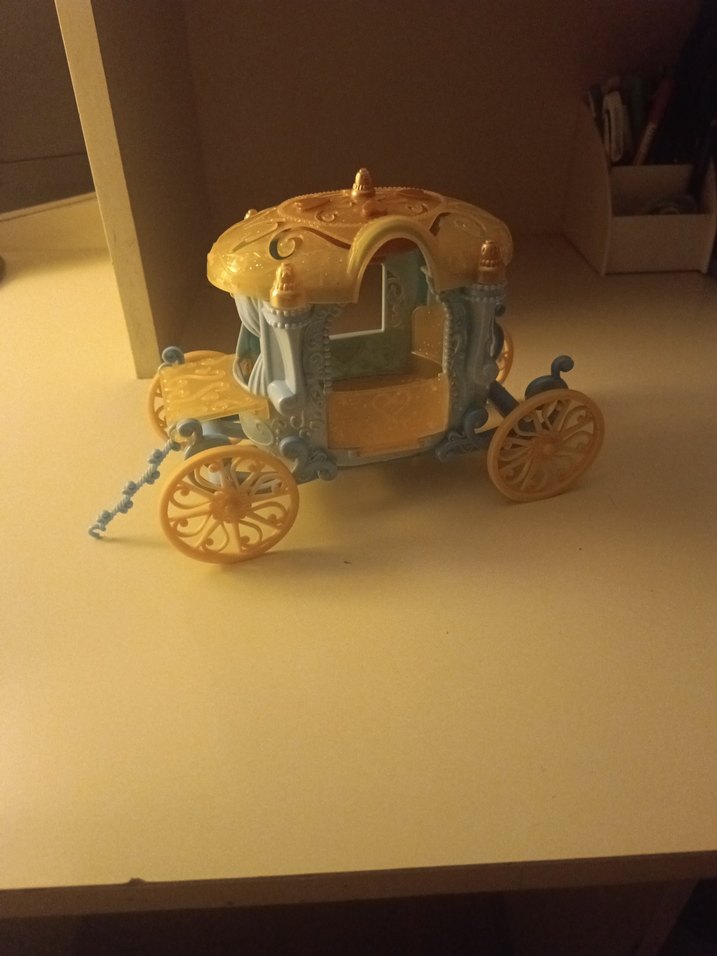 Detaylı tasarıma sahip sarı pastel renkli oyuncak fayton, dört tekerlekli ve nostaljik görünümlü. Hayal gücü oyunları için uygun.