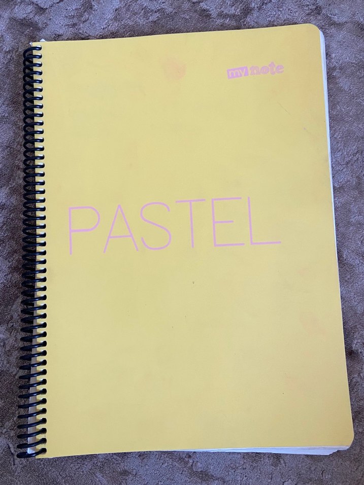 Sarı renkli, pastel kapaklı spiralli defter. Ön yüzünde pembe 'PASTEL' ve 'my note' yazıları bulunur. Düz ve sade tasarımlıdır. Proje ödevim için yaptığım her sayfasında 1 adet resim bulunan İngilizce sözlük
