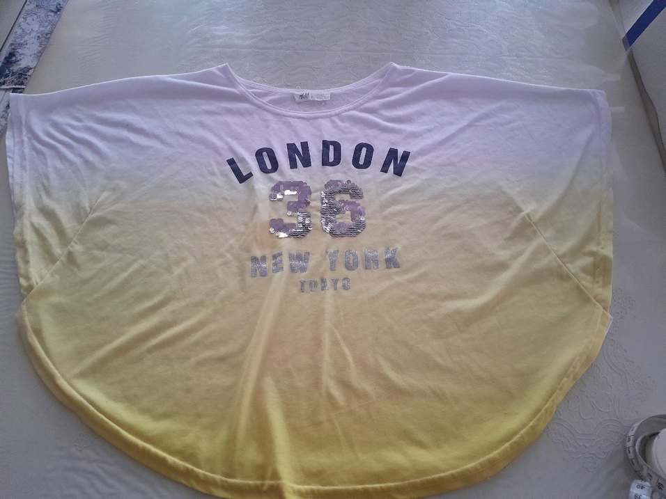 Pamuklu, kısa kollu, yuvarlak yakalı ve bol kesim kız tişörtü. Pastel sarı renkte, şehir isimleri baskılı ve payet detaylı. ✨