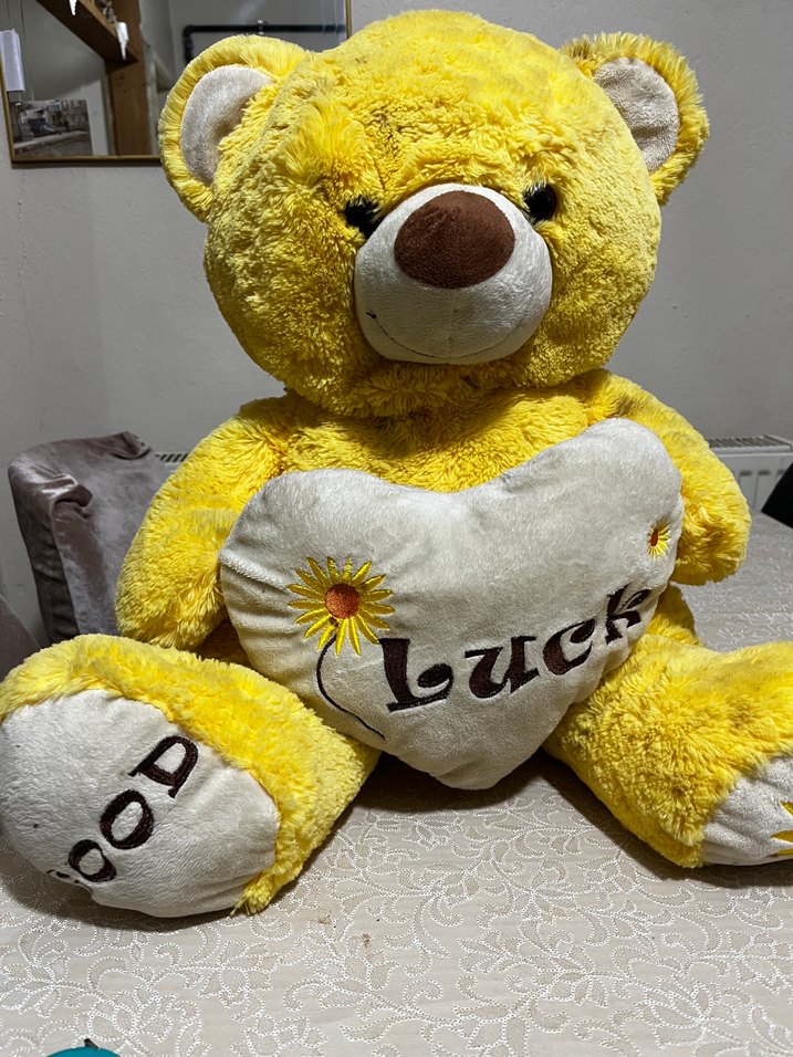 Renkli sarı peluş ayıcık, kalp şeklinde "Luck" ve "Good" yazılı yastık tutuyor, ayıcık üzerinde ayçiçeği desenleri var. Yumuşak ve sevimli.