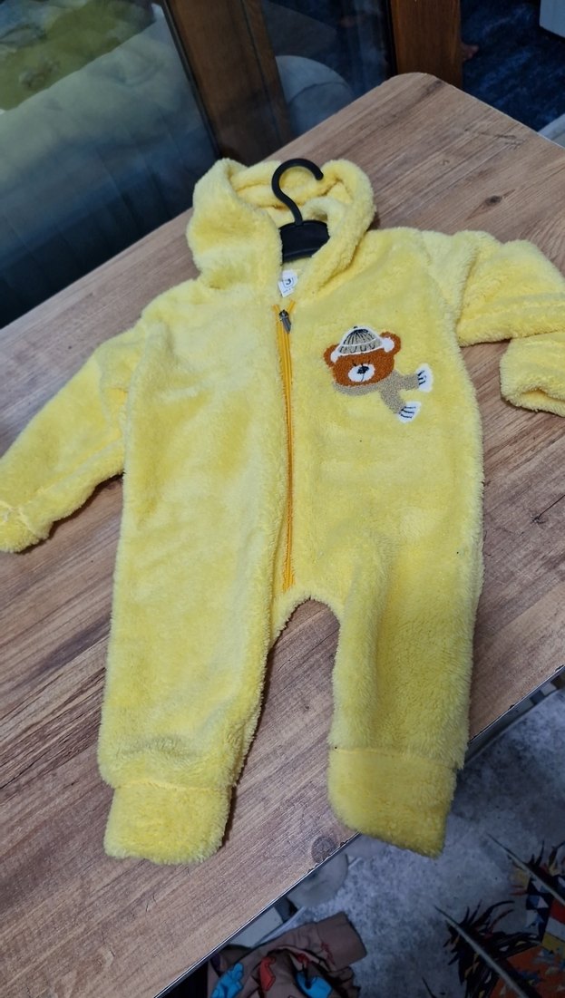 Sarı peluş kumaştan yapılmış, ayıcık desenli ve kürk detaylı bebek tulumu, sokak stiline uygun.