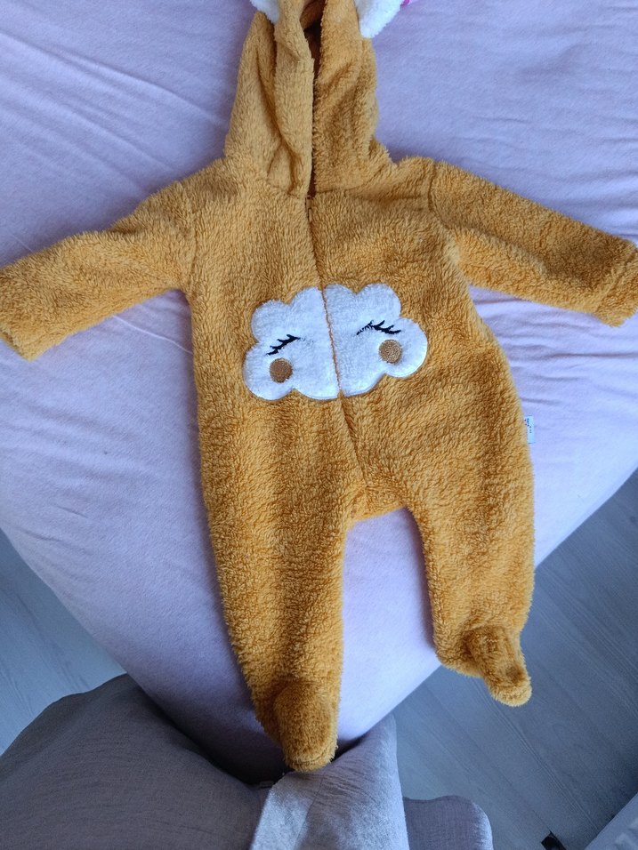 Sarı pastel renkte, yumuşak ve sıcak kumaştan yapılmış kapüşonlu bebek tulumu. Kürk detaylı ve baskılı bulut deseniyle sıcak tutar.