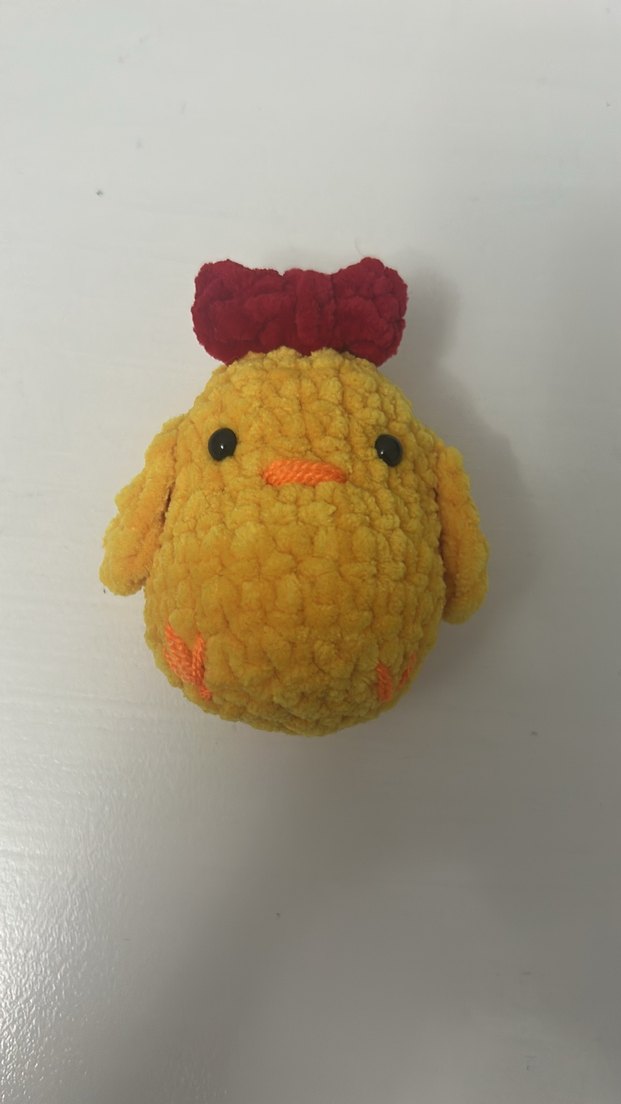 Yumuşak dokulu, kırmızı tarak detaylı sarı civciv şeklinde peluş oyuncak. Renkli ve sevimli. İsteğe göre anahtarlık aparatı, magnet olarak kullanmanız için mıknatıs ekleyebilirim. Kadife ipten yapıldı. Boyu 6 cm.