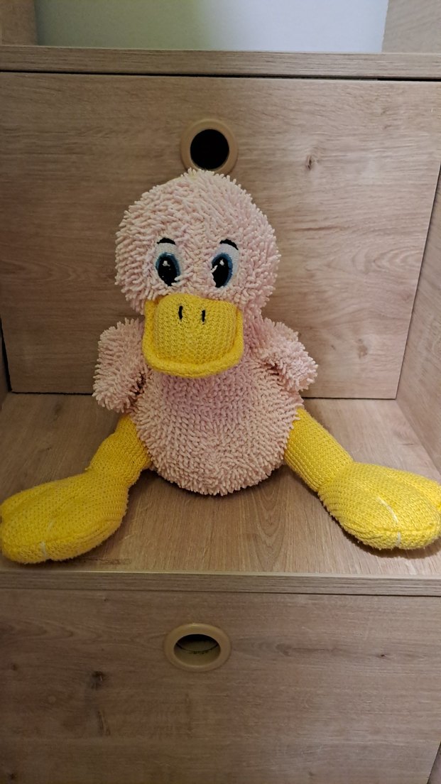 Yumuşak ve renkli sarı peluş ördek oyuncak, büyük ayakları ve detaylı yüz ifadesiyle sarılmak için uygundur.