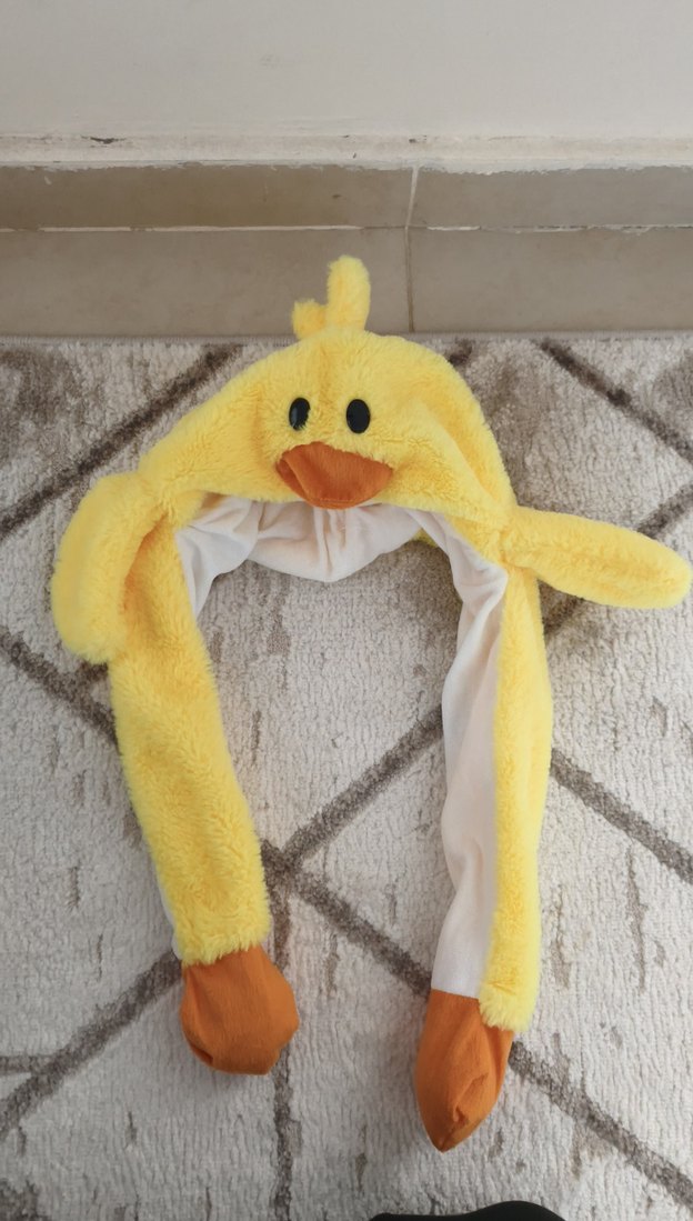 Yumuşak peluş sarı ördek şapka, uzun kulak detaylı ve turuncu gagalı. Rahat ve sevimli tasarım.