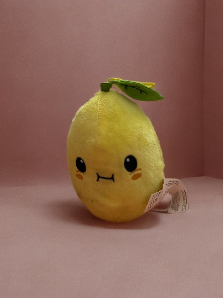 Yumuşak sarı peluş oyuncak, küçük bir yaprak detayı ile sevimli meyve şeklinde. Koleksiyon veya hediye için uygun.