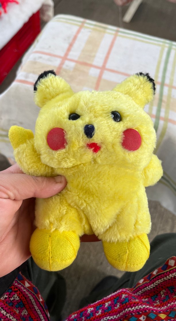 Siyah uçlu kulakları ve kırmızı yanakları olan yumuşak sarı peluş oyuncak Pikachu.