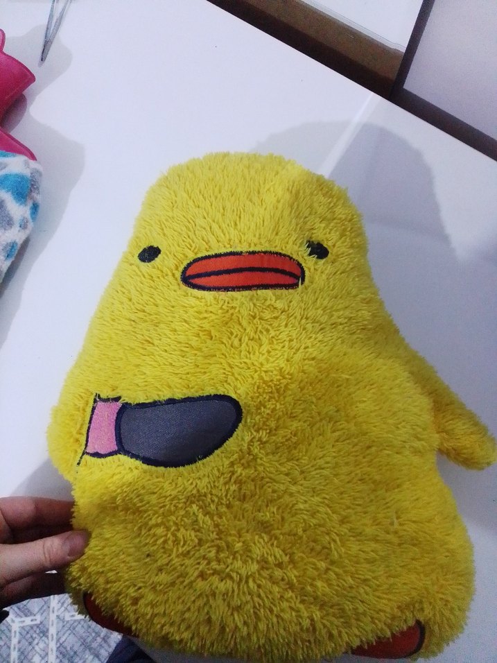 Yumuşak ve renkli sarı peluş oyuncak, ördek şeklinde, basit yüz detayları ve küçük kanat tasarımı ile.