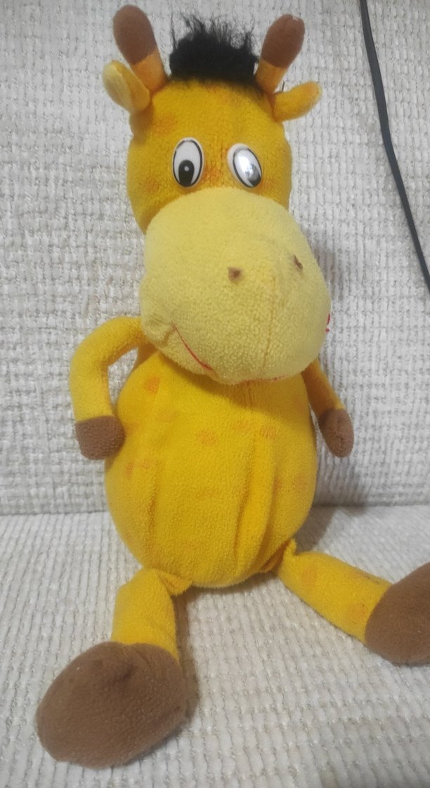Yumuşak kumaştan yapılmış, kahverengi detaylı sarı renkli peluş zürafa oyuncak. Büyük gözleri ve sevimli ifadesi bulunur.
