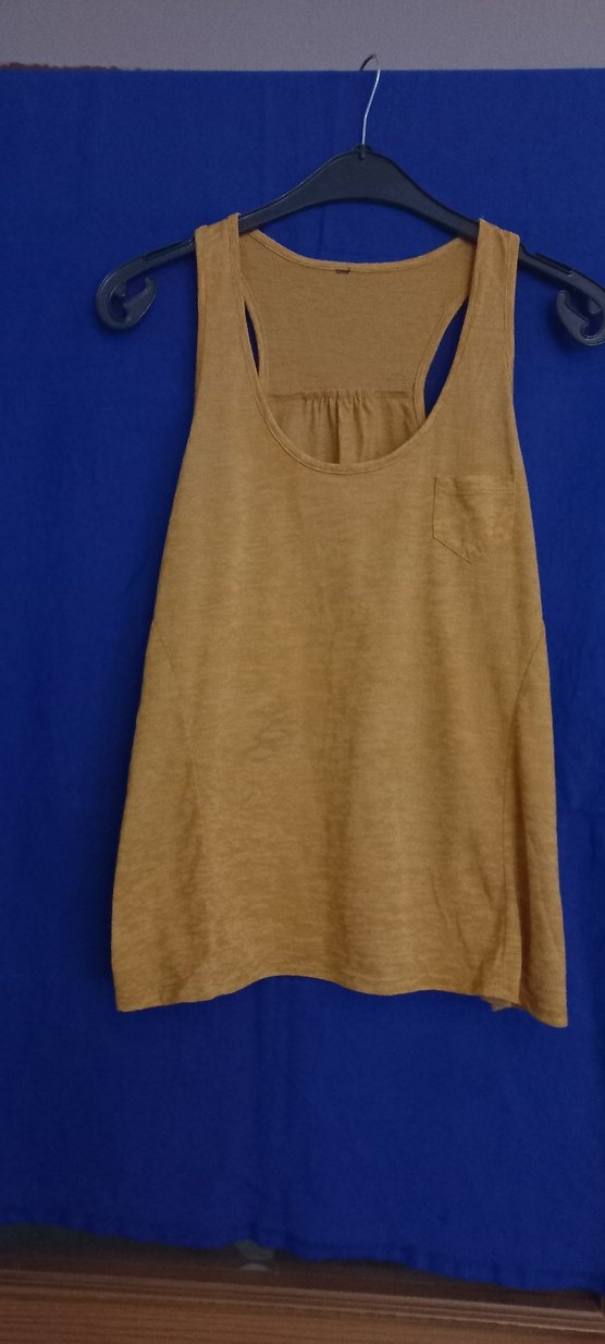 Nefes alabilen penye kumaştan yapılmış sarı askısız kadın atlet. Salaş kesimi ve günlük kullanıma uygun rahat tarzı vardır.