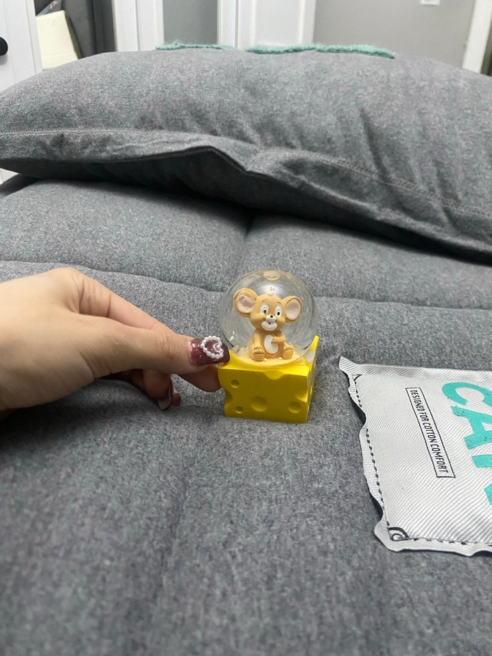 Renkli fare figürin, şeffaf kubbe içinde, sarı peynir şeklinde taban üzerinde oturuyor.
