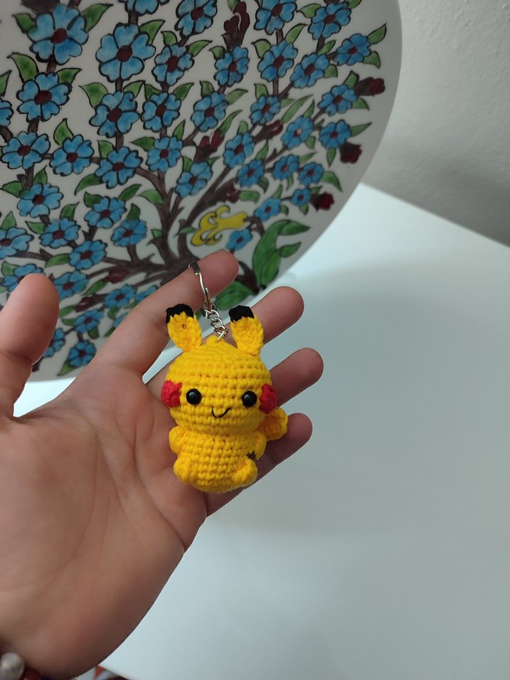Renkli örgü dokusuyla yapılmış küçük sarı Pikachu peluş oyuncak anahtarlık.