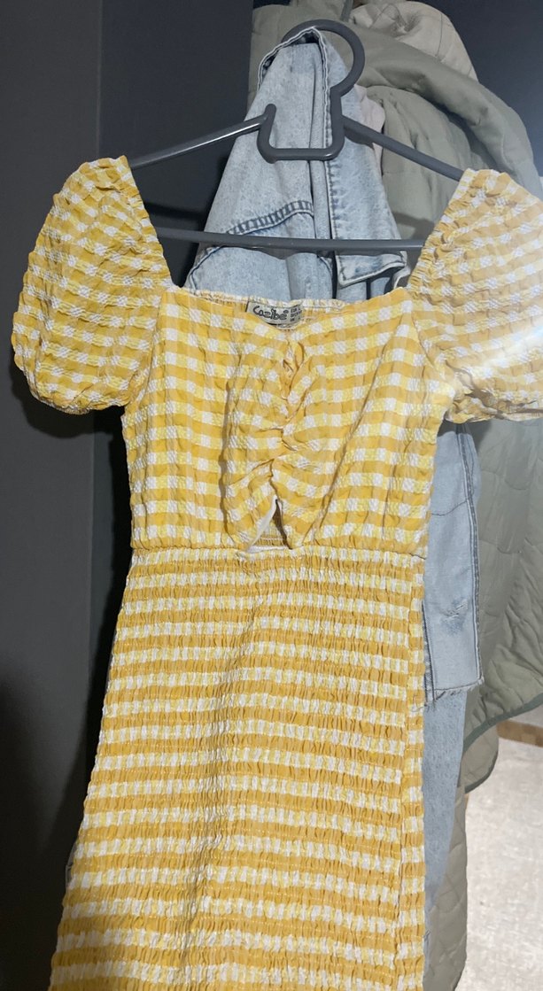 Fitted kesim, midi uzunlukta sarı pileli hamile bluz. Keten kumaştan, kısa balon kollu ve tekne yaka detaylı, rahat sokak stili için uygun.