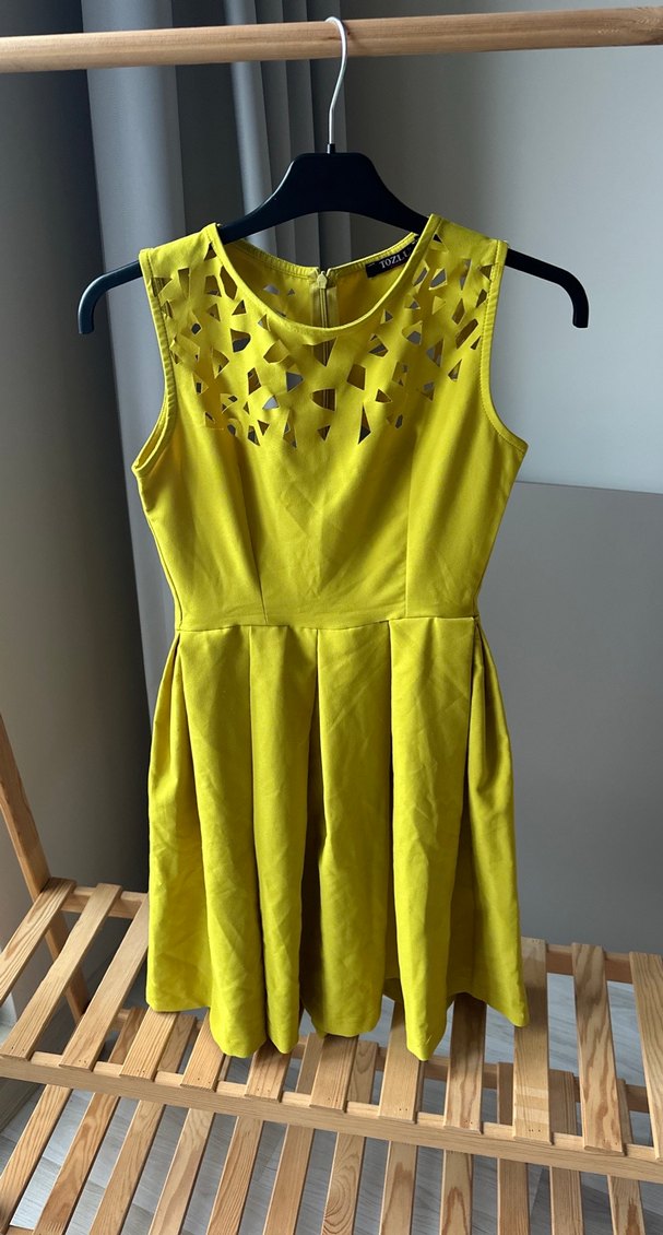 Kolsuz, pilili etekli ve beli oturan sarı elbise. Parlak yüzey ve dekoratif kesikli yakasıyla romantik akşamlar için uygun.
