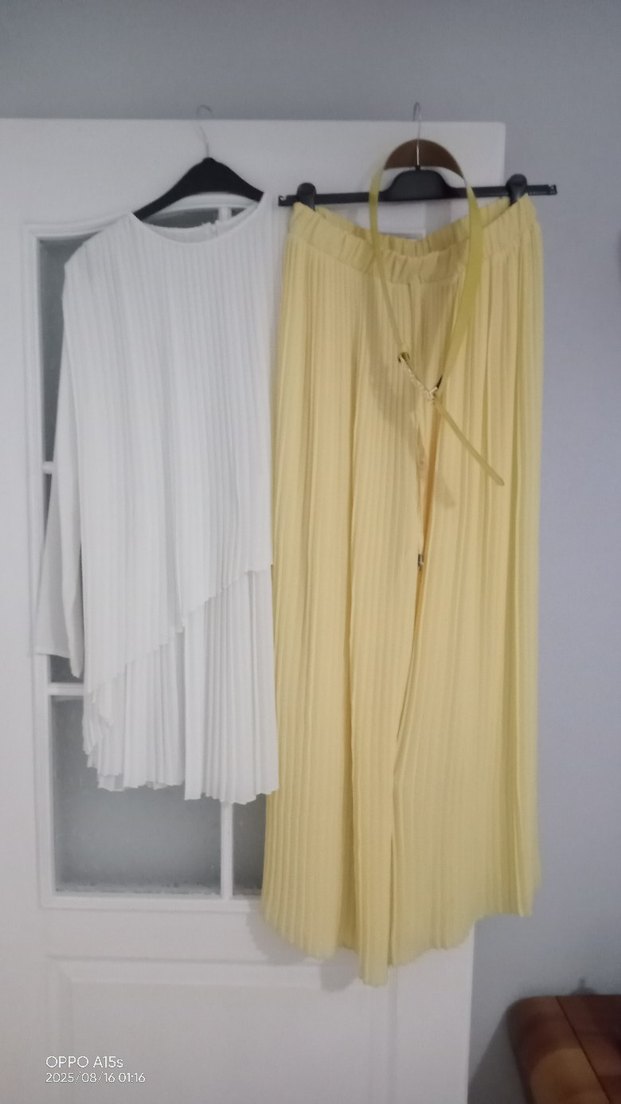 Sarı pilili ikili takım bol kesim ve hafif sentetik kumaştan üretilmiştir, günlük kullanıma uygundur.