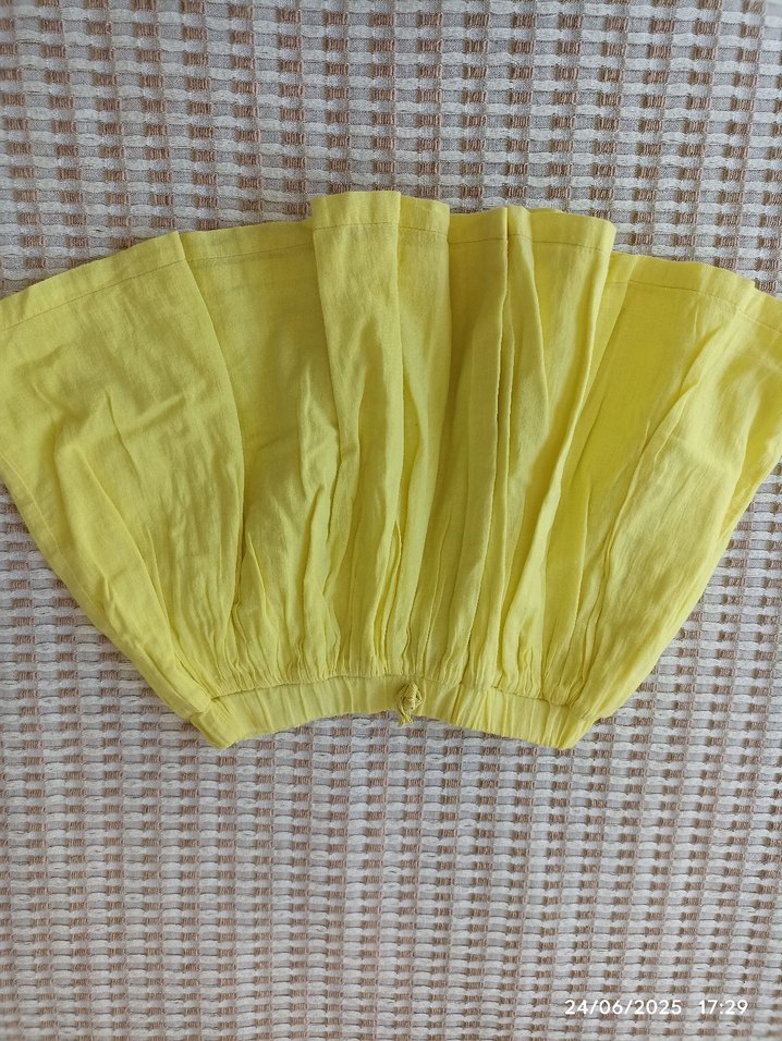 Yumuşak keten kumaştan, bol kesim pilili sarı etek. Bohem tarzıyla rahat ve hafif bir görünüm sunar.