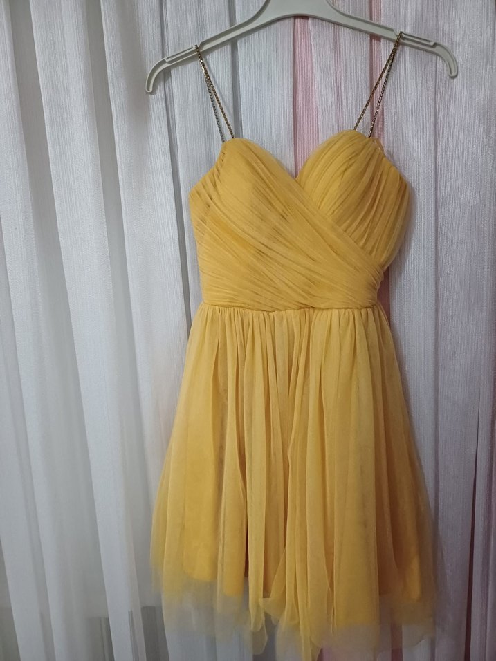 Sarı renkli, askılı ve straplez yaka detaylı pilili midi uzunlukta abiye elbisedir. Fitted kesimiyle parti için uygundur, modern klasik ve göz alıcı bir stildir.
