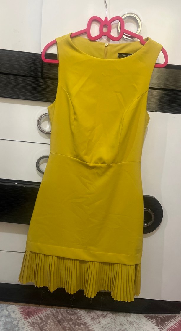 Kolsuz, pilili etek ucu ve dar kesimli sarı midi elbise, ofis için mezuniyet için düğün içinuygun. kumaşı tok bir kumaş içi de astarlı şık bir elbise