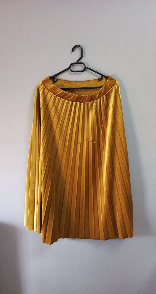 Sarı renkli, parlak sentetik kumaştan yapılmış pilili ve bol kesim midi etek. Minimalist ve bohem tarzıyla günlük kullanıma uygundur.