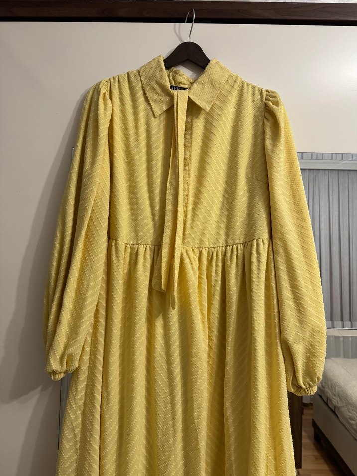 Sarı keten midi elbise, uzun kollu, yakalı ve pilili detaylara sahip, bol kesim vintage tarzıyla ofis için uygun.