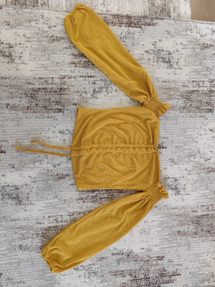 Sarı renkli, pilili uzun kollu, tekne yaka ve kısa kesim, vücuda oturan kadın bluz. Bohem ve retro tarzda, günlük sokak giyimine uygun.