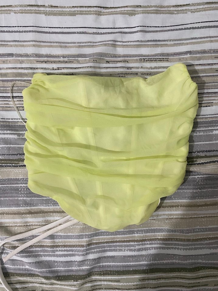 Bu sarı büstiyer, pilili detaylara ve straplez yakaya sahip olup yumuşak sentetik kumaştan yapılmıştır. Mini boyu, avangart parti stilleri için uygundur.