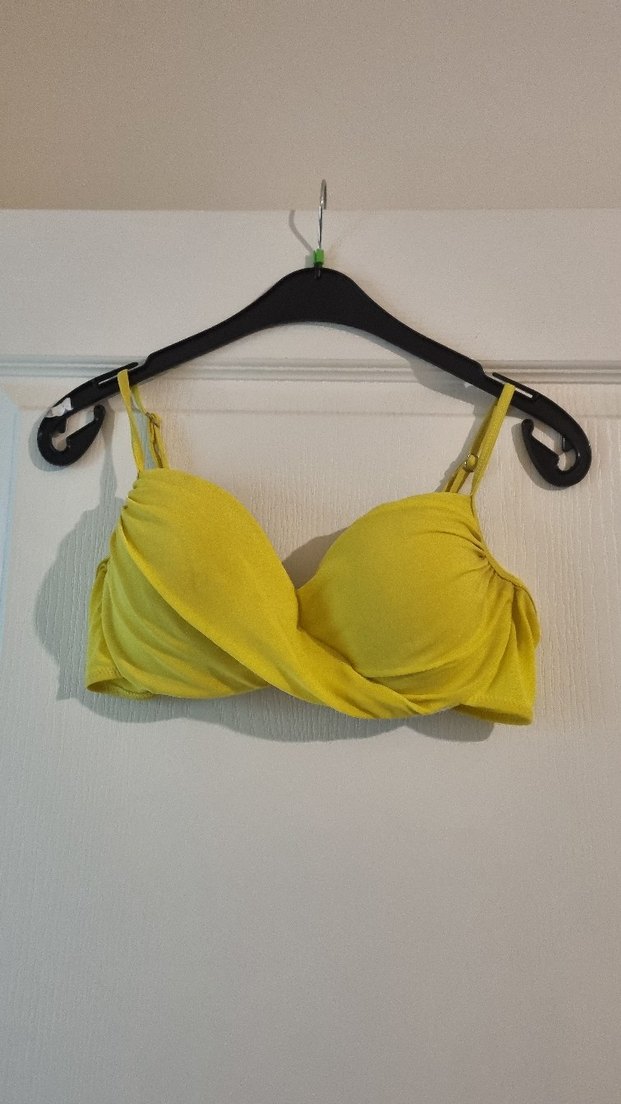 Pilseli detaylara ve ince askılara sahip, vücuda oturan sarı bikini üstü. Minimalist ve çağdaş tarzda, plaj için uygun.