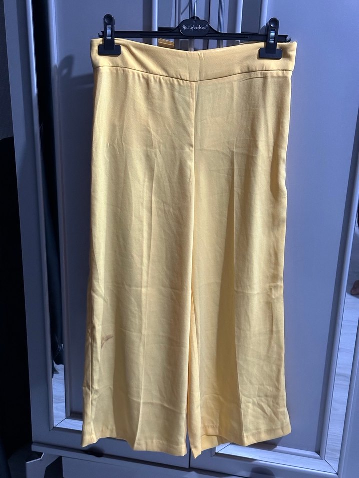 Sarı bol kesim ve piliseli tasarıma sahip, ipeksi kumaştan yapılmış kadın kumaş pantolon, günlük kullanım için uygun ve minimal tarzda. (Evimi ve dolabımı sadeleştiriyorum.)