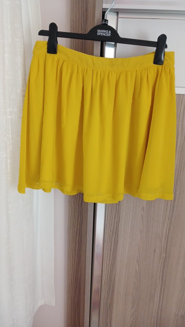 Sarı renkte piliseli midi kadın etek, bol kesimdir. Parlak ve sentetik kumaştan yapılmış, modern ve ofis kullanımı için uygundur. on bel 42.boy 45 cm.astarlıdır...