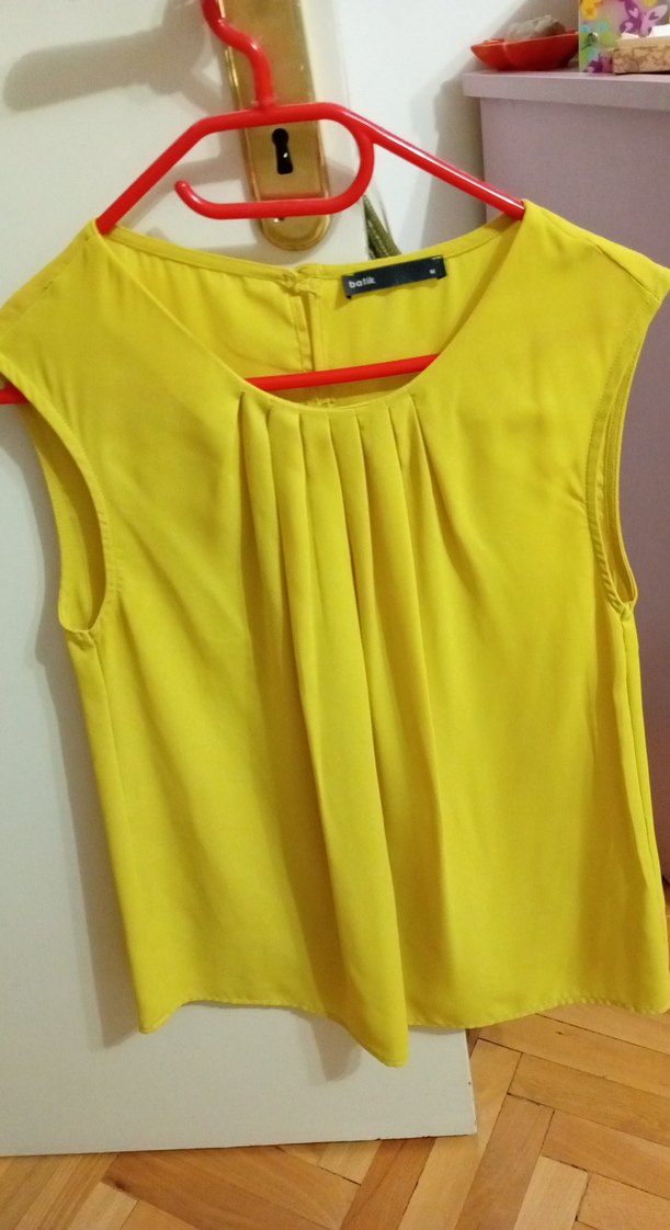 Satenimsi kumaştan yapılmış, piliseli öne sahip sarı kolsuz bluz. yuvarlak yakalı, bol kesim ve normal midi boyda, günlük kullanıma uygun.