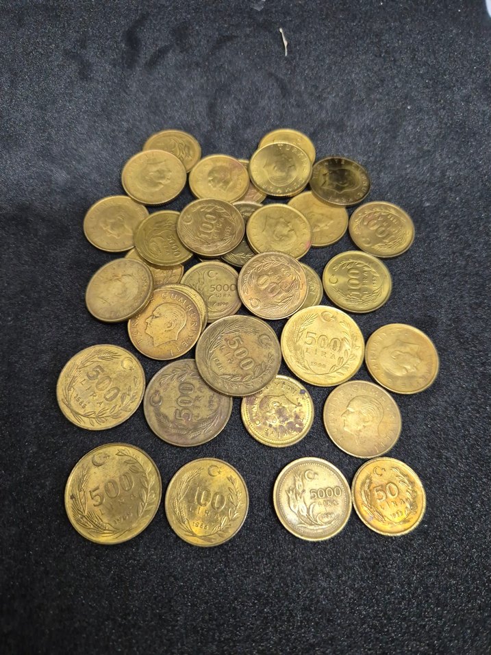 35 adet pirinç sarı renk madeni paralar.