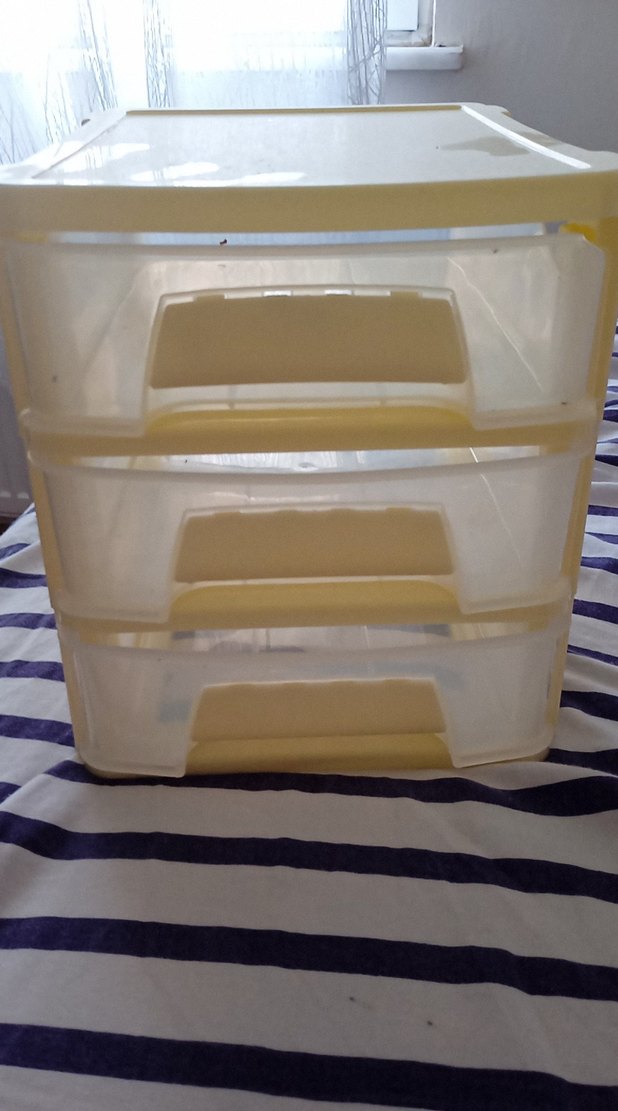 Hafif sarı renkte, üç çekmeceli plastik dolap düzenleyici. Eşyalarınızı düzenlemek için kompakt ve kullanışlı tasarım. ️