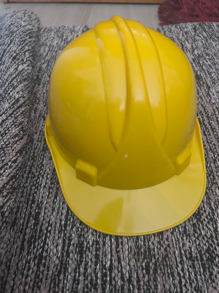 Velcro bantlı, sarı plastik işçi koruma kaskı, sade ve desensiz tasarıma sahip.